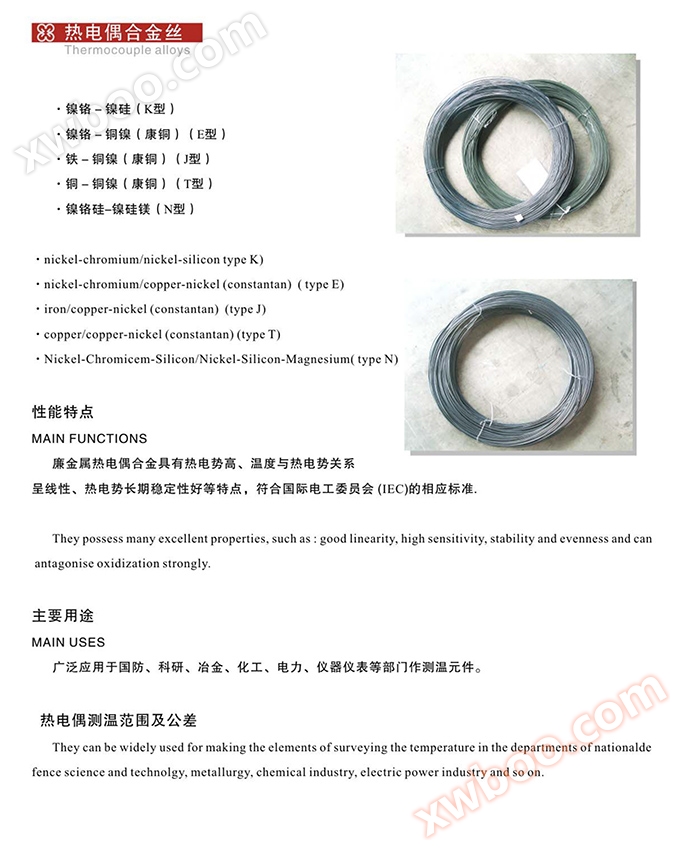 থার্মোকপল খাদ তারের ব্যাপকভাবে প্রতিরক্ষা, গবেষণা, ধাতবিদ্যা, রাসায়নিক শিল্প, বিদ্যুৎ শক্তি, যন্ত্রপাতি এবং তাপমাত